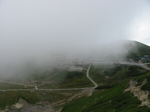 畳平のバスターミナルが見えてきたと思ったら、霧が出てきてあっという間に何も見えなくなった。