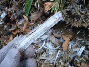 日陰には長い霜柱あり。娘が一緒なら壊しながら進むので時間をロスしていただろう。