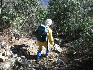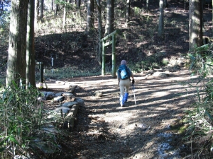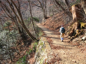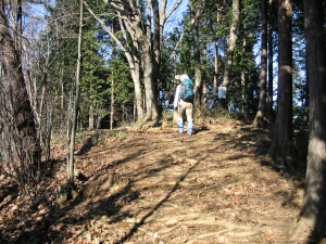 神社の石段横から坂をジクザクに下りて、大岳山へ向かう山道に出る。長尾平は帰りに寄ることにして先へ進んだ。