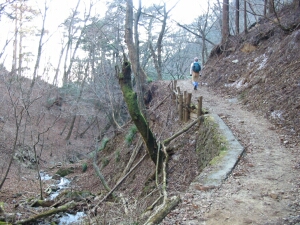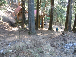 平坦な道が続くが、沢沿いの東屋を過ぎるとジグザクの上りとなる。
