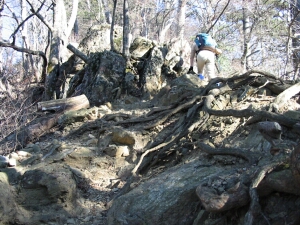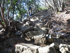 芥場峠から奥ノ院分岐を過ぎると鎖や鉄梯子のある岩場となるが、それもすぐ終わる。