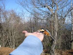 嫁の手のひらにもヤマガラがやってきた。今回はこの餌やりが一番楽しかった。
