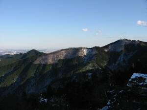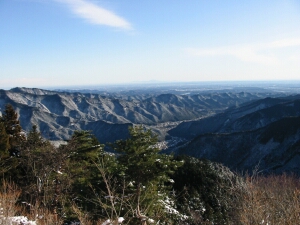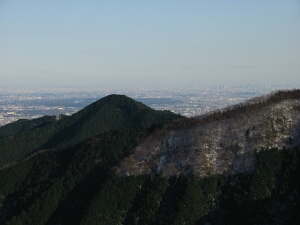 左は高水三山 (岩茸石山、惣岳山、高水山) 。中央奥には筑波山と東京のビル群も見えた。