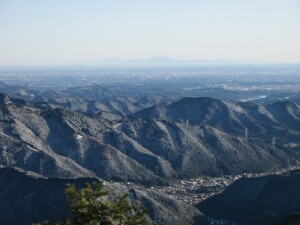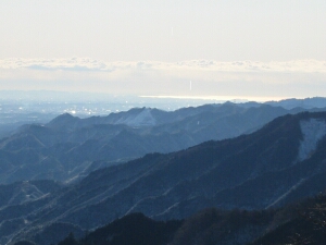 日の出山と高峰の間に、朝よりもはっきりと東京のビル群が見えた。
