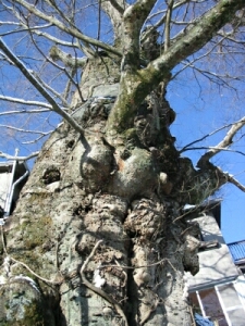 樹齢千年の「神代欅 (ケヤキ)」。御岳神社までは、民宿などの集落を通るがその途中にある。