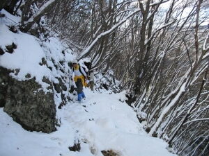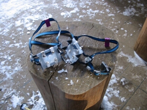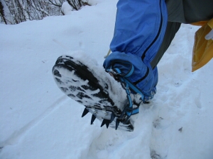 雪で踏んばりがきかないので、途中から前日に購入しておいた軽アイゼンを装着した。