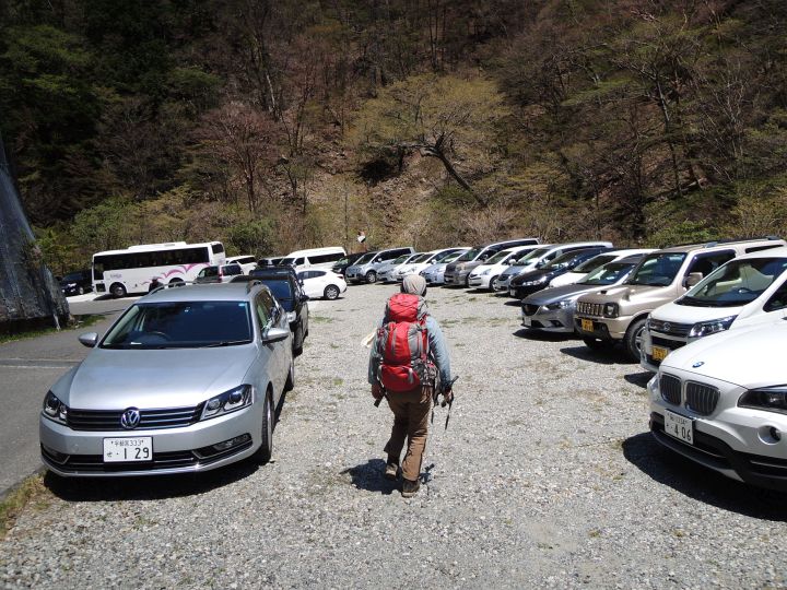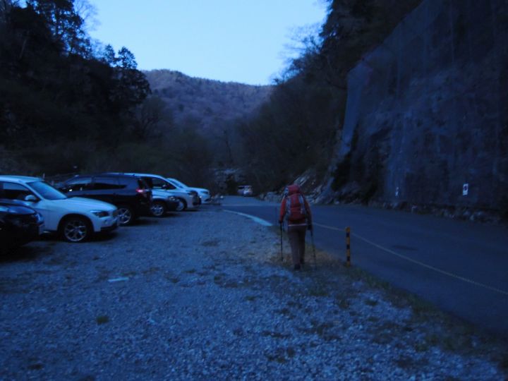 4時前に行者還トンネル西口に着いたがすでに停める場所がなく、登山者の出足の早さに驚いた。路駐車の後ろが数台分のスペースがあったので、そこへ駐車。道路脇にロープで入れない広いスペースがあったが、そこも駐車場だったらしく、出発の準備をしているうちに管理人が来て、そちらへ車を移動するように言われた。 路上駐車のまま出発するよりも、駐車場に停めた方が気分的に安心ではあるが、管理人が来る前に停められないと見て移動して行った車も多数あり、何故ロープで入れないようにしておく必要があるのか疑問に感じた。その後は次々と車が入ってきて、出発する頃には満車となった。