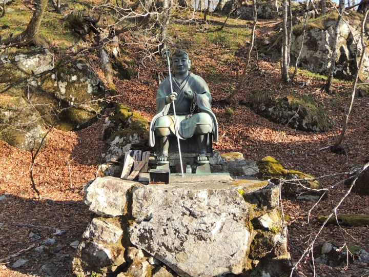 弁天の森からしばらくはゆるやかな下りが続き、6:45 聖宝ノ宿跡、理源大師像に到着。聖宝理源大師(832-909年)は実在の高僧で、大峰山の祖とされる修験道当山派の開祖にして醍醐寺の開山。