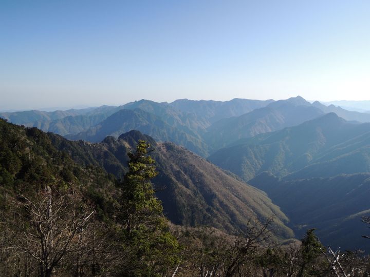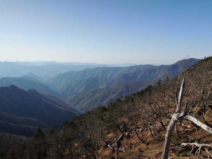 西側の眺め。立ち枯れた木々の右向こうに頂仙岳、その右奥は金剛山も見える。大峰山系の立ち枯れについては何度か本格的な調査が行われており、シカによる食害と酸性雨などが原因と見られている。