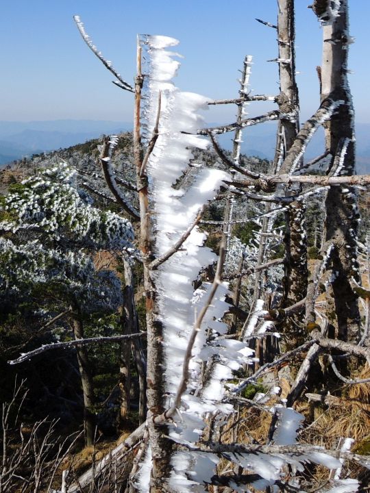 途中の樹木が霧氷に覆われて陽光に輝いていた。
