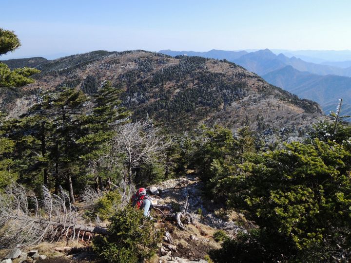 南側には大峰山脈の稜線が延びており、その先に仏生嶽と釈迦ヶ岳が並ぶ。