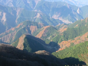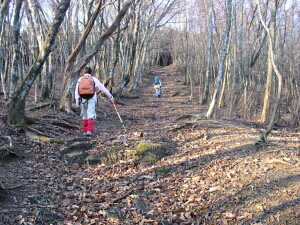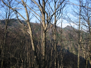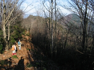 途中、雑木の間から小持山へ続く稜線が見えた。上の方は完全に紅葉が終わっていた。