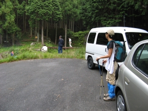 登山口付近でデイキャンプをするおじさんグループに出くわした。車をきちんと端に停めて出発。