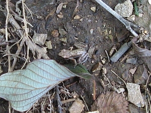 嫁が小さいカエルを目ざとく見つけた。ニホンアカガエルの子供かな。
