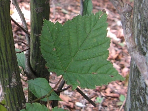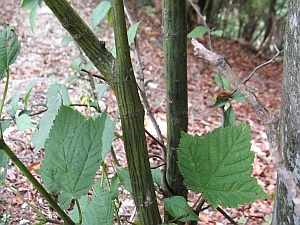 葉は対生の鋸歯縁。カエデにしては鋸歯の切れ込みが浅い。山頂付近で多く見かけた。