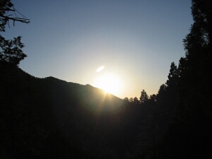 上り始めるとちょうど朝陽が射し込んできた。