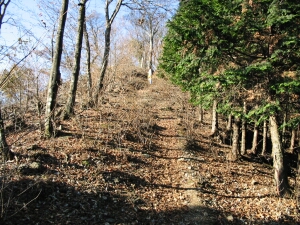 急坂ではないものの延々と上りが続く。沢筋から檜の植林を通過して鎌倉街道の一部である妻坂峠に出た。