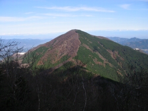 北方面の武甲山。山頂へ続く縦走コースの尾根道がよく見えた。秩父側の削りとられた山容とは表情が異なる。