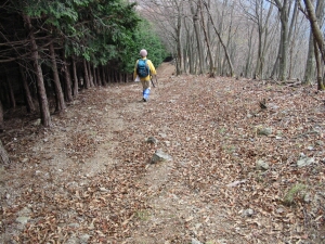 妻坂峠までは急な下りが続く。後ろ向きになって下りたり、蛇行したりして膝への負担を減らした。