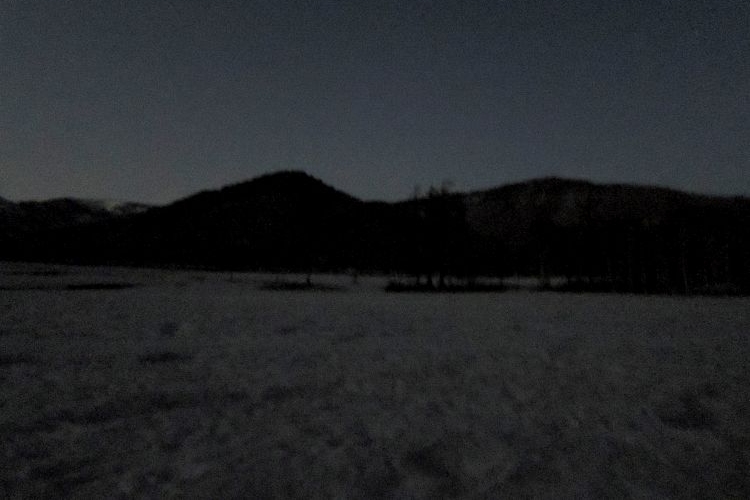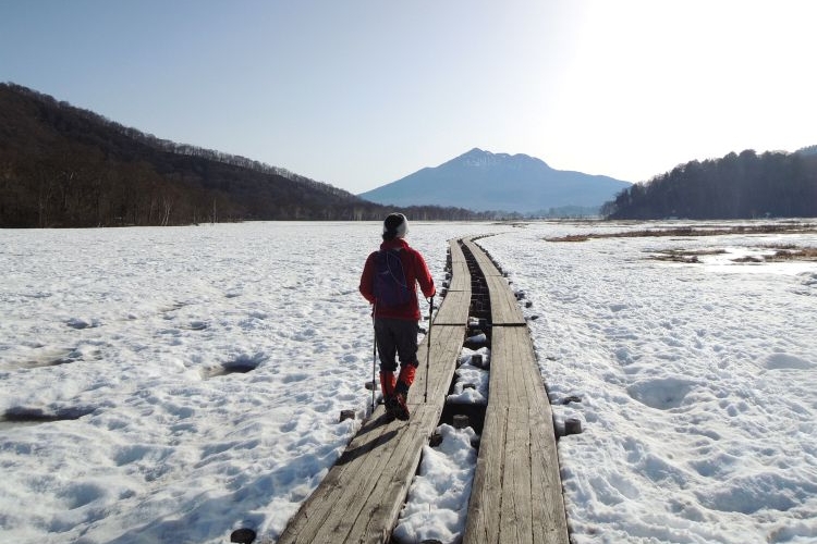 雪原がうっすら青く、凛とした空気が漂う朝の尾瀬ヶ原。