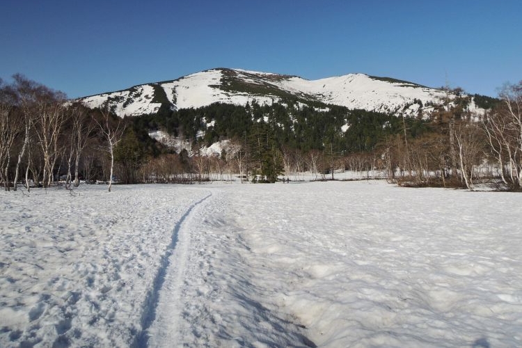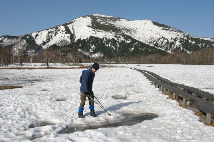 3時に起きて星空を見ようと尾瀬ヶ原に出るが、めまいが酷くて引き返した。ひと眠りして回復したので、予定どおり朝食後は尾瀬ヶ原の散策に出かけ、ゆっくり竜宮小屋まで歩いてきた。ミズバショウはすでに咲き始めていて、春の息吹を感じながら雪の残る尾瀬の広大な自然を満喫した。テント場は混んでいたものの、尾瀬ヶ原に人の姿は少なくて、終始のんびりと気兼ねなく木道を歩くことができた。
