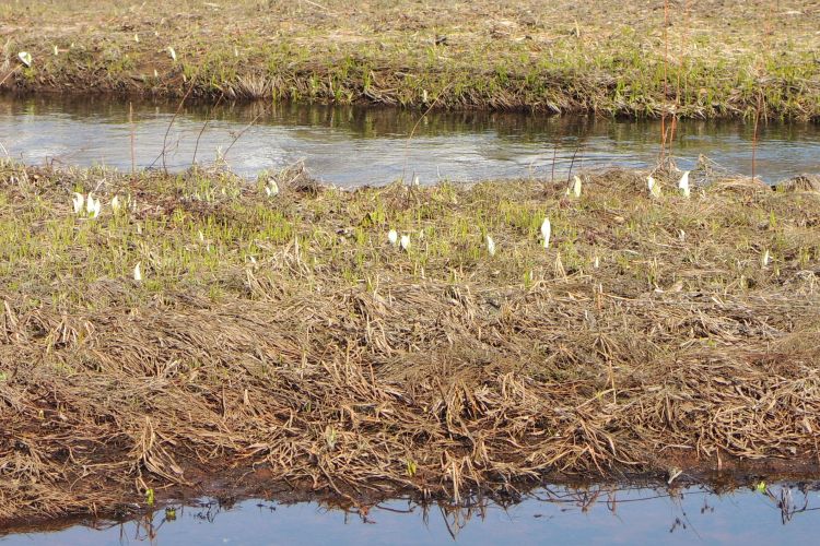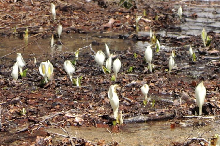 ミズバショウの群生。前日の往路では気づかなかったので、一夜にして芽吹いたようだ。