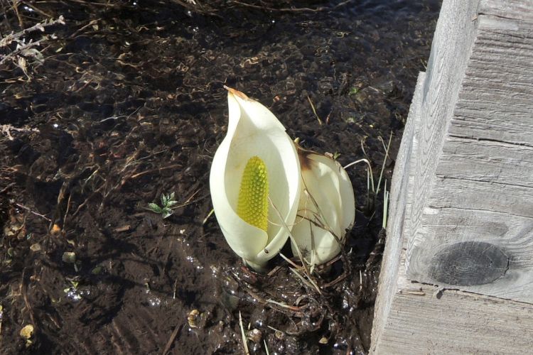 木道脇に点々と咲いていたミズバショウ。