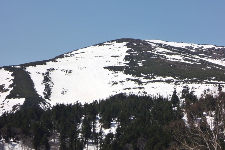 至仏山の雪の斜面を登っているハイカーの姿が、小さな点となって見えていた。