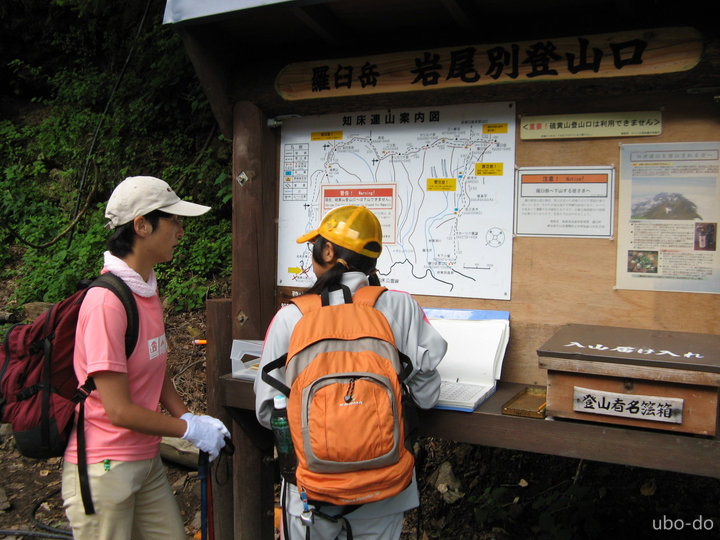 | ルート所要時間 | キャンプ場 4:30 → 木下小屋登山口 5:30 → オホーツク展望台 6:15 → 弥三吉水 7:10 → 銀冷水 8:20 → 羅臼平 9:35 → 岩清水 10:10 → 11:00 羅臼岳山頂 12:15 → 岩清水 13:05 → 羅臼平 13:40 → 銀冷水 14:25 → 弥三吉水 15:15 → オホーツク展望台 15:50 → 木下小屋登山口 16:25 → キャンプ場 17:00 → 湯元天然温泉 |