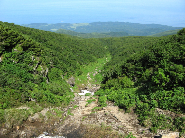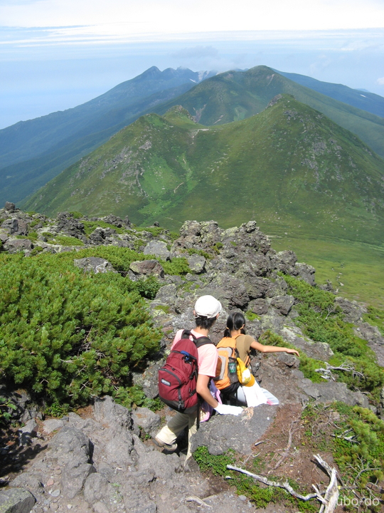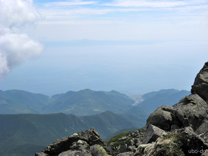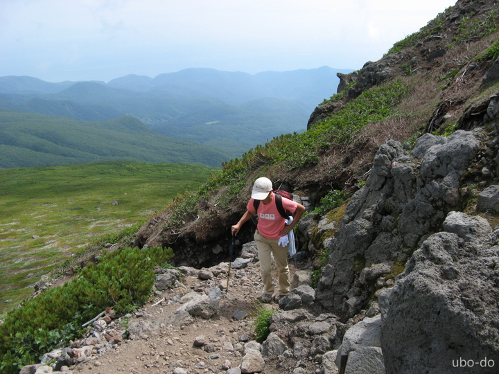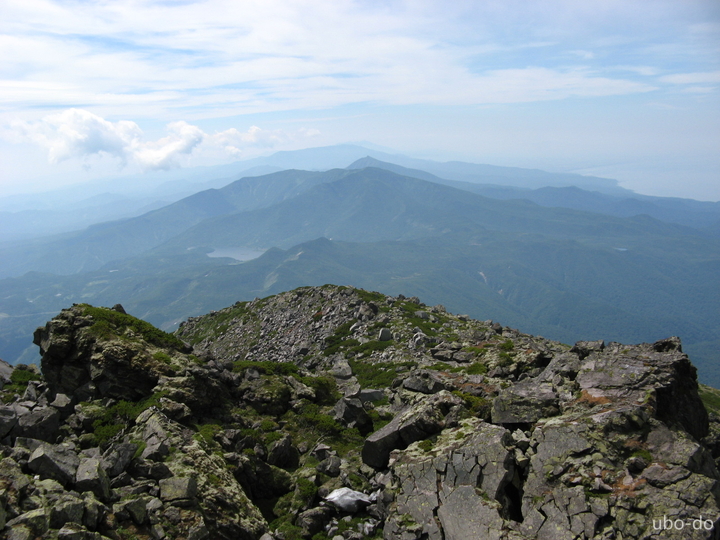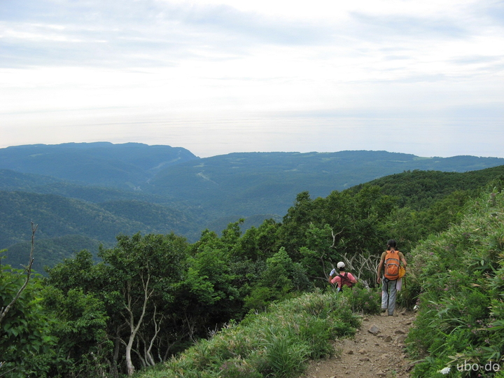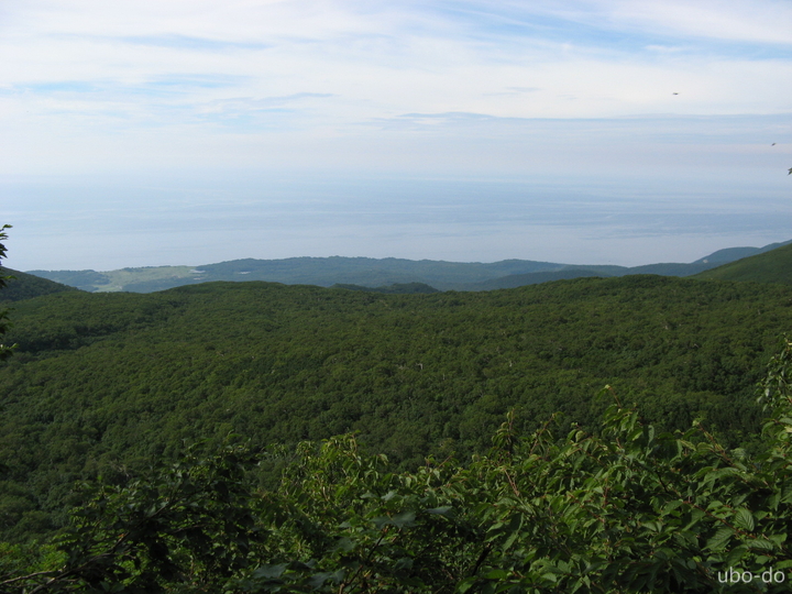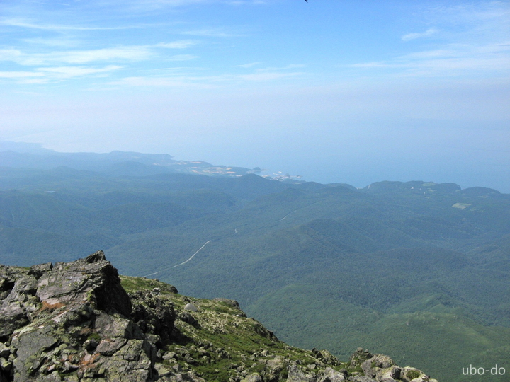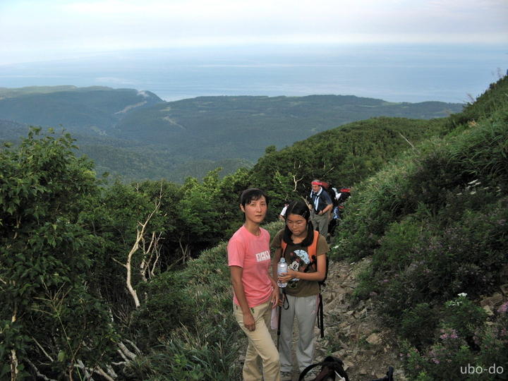 樹林が切れて岩峰に出ると、頂上まで5.9km地点の「オホーツク展望台」。少し上ったところの方が展望がよく、背後にオホーツク海が広がっていた。