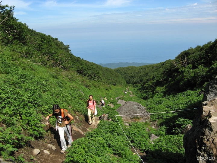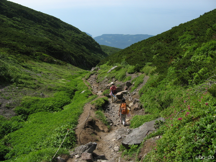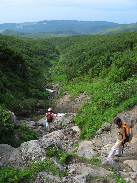 オホーツク海の絶景を正面に見ながら、大沢のガレ場を下っていく。