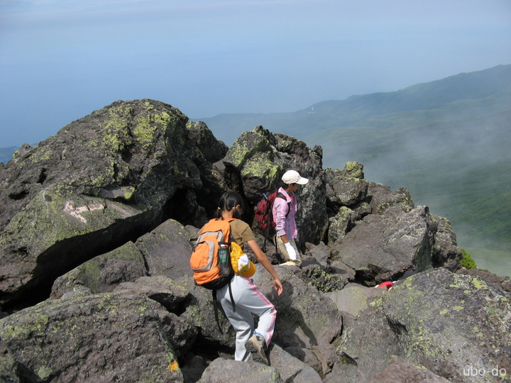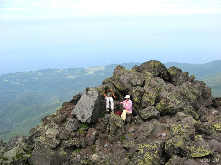岩場の向うは、知床五湖とオホーツク海。空にはツバメが飛び交い、最高の気分で羅臼岳山頂を満喫した。