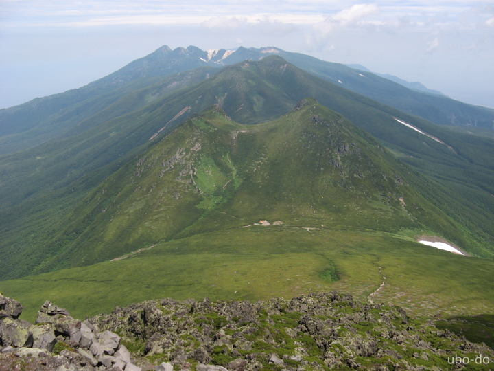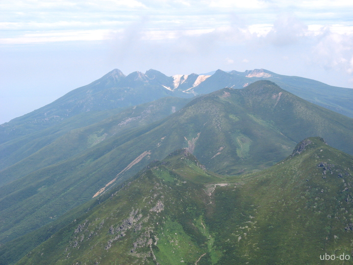 北東の知床連山。三ツ峰、サシルイ岳、オッカバケ岳、南岳、知円別岳、硫黄山と続く雄大な山並み。眼下には登ってきたルートが小さく見えた。