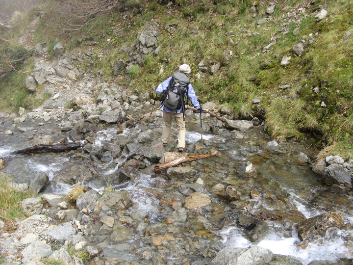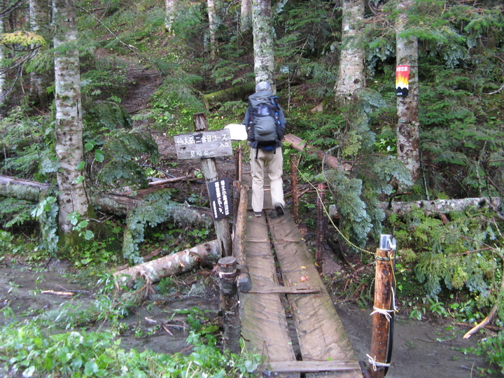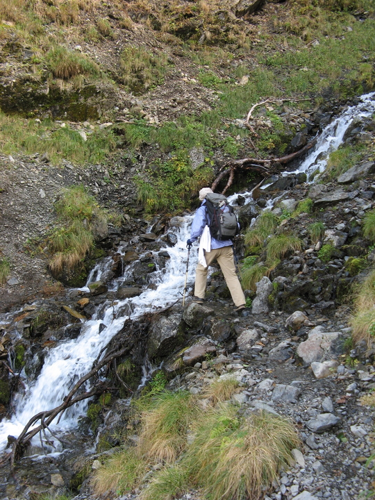 五合目の大滝ノ頭へ向かうコースは沢を渡った先。ストックでバランスをとり、慎重に渡る。