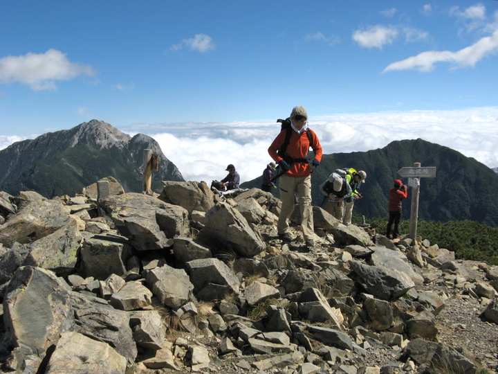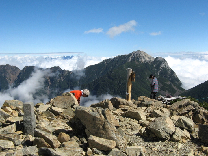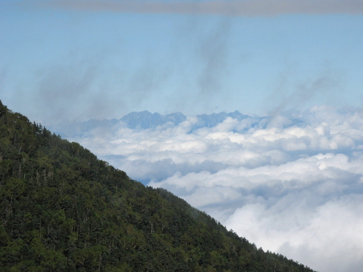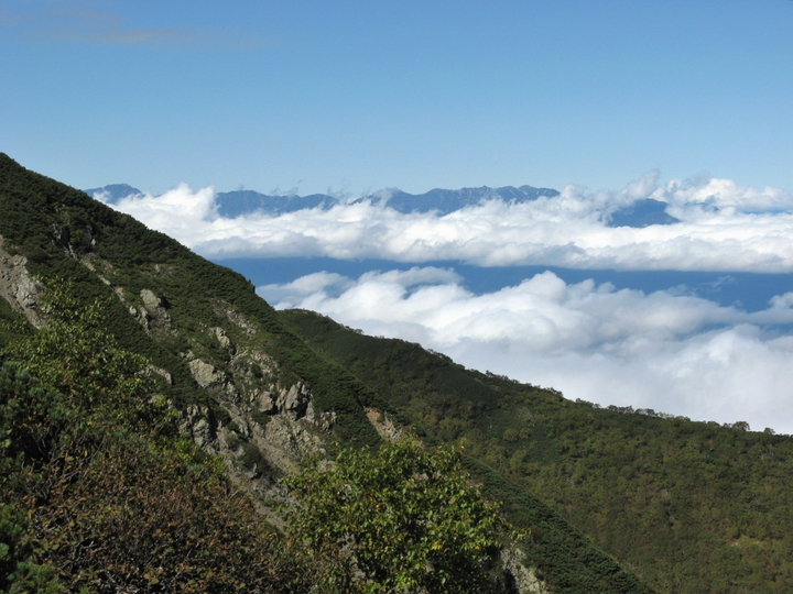 北西方面の雲海に浮かぶ穂高と槍ヶ岳。名峰は見えただけで得した気分になれる。