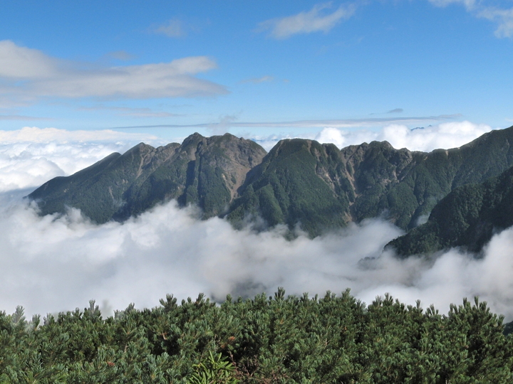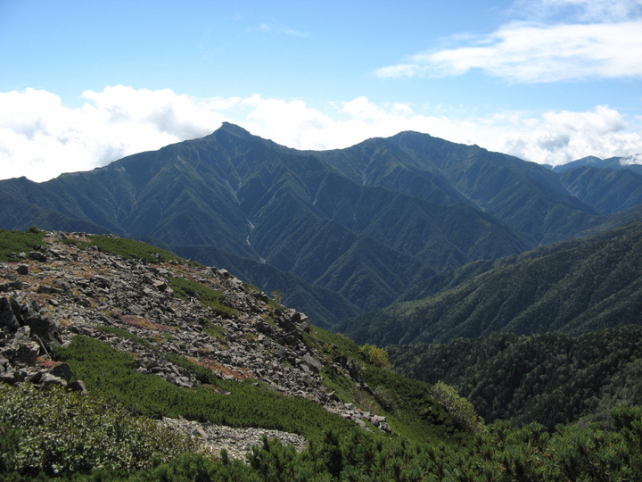 南側の仙塩尾根と大仙丈ケ岳。尾根の向こう、南東側が大仙丈沢カールで、仙丈ケ岳は3つのカールを擁している。