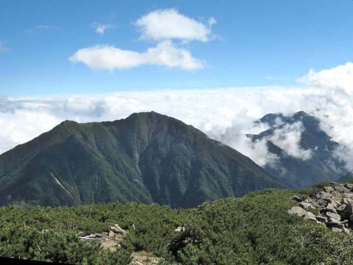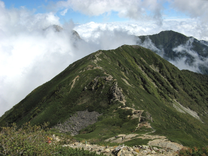 小仙丈ケ岳のガスは消えて青空がのぞいていた。