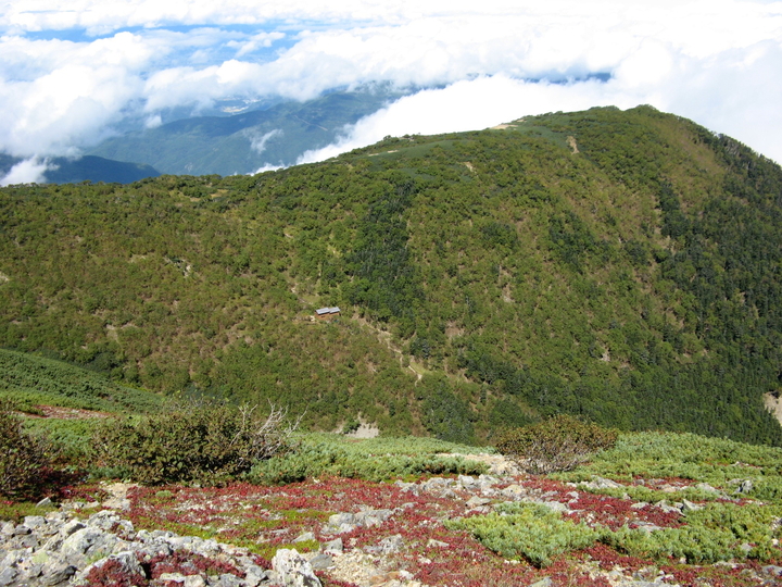 馬ノ背の中腹には馬ノ背ヒュッテが小さく見えた。