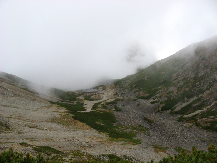 藪沢カールの底を見下ろすと、いまにもガスに飲み込まれそうな仙丈小屋が見えた。