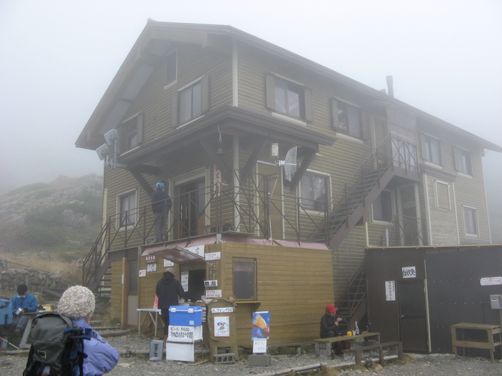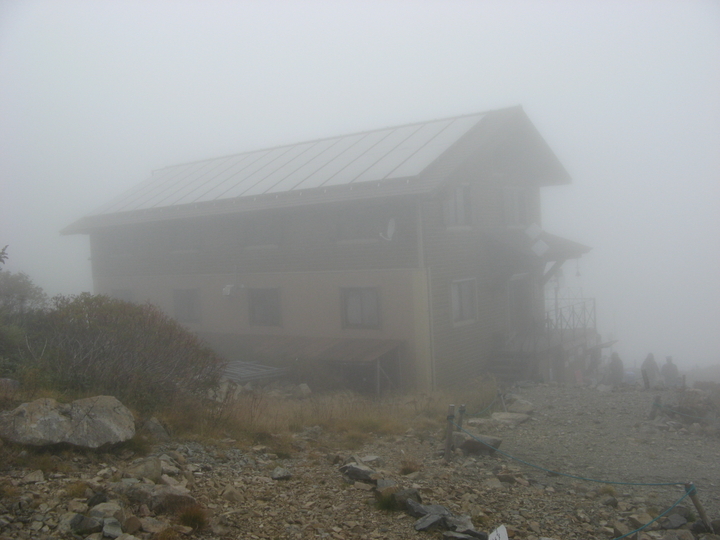 12:30 霧の中に仙丈小屋が突然現れた。