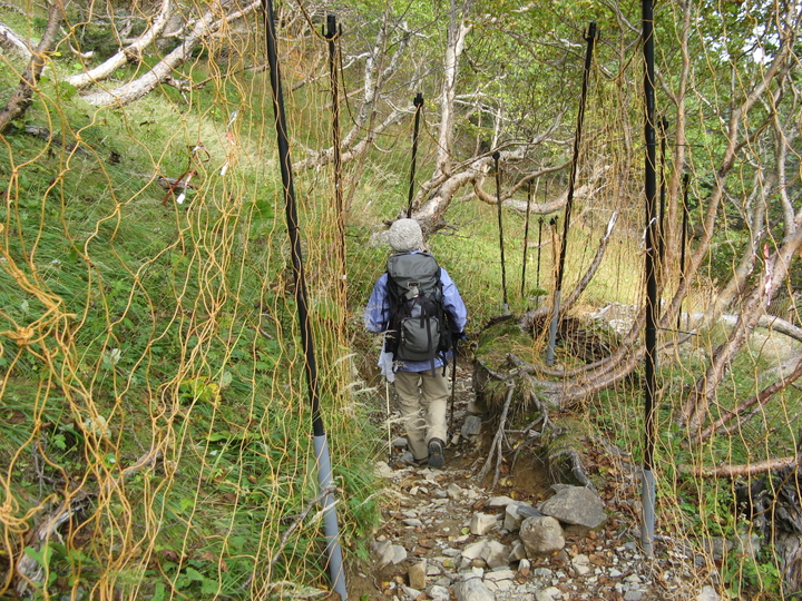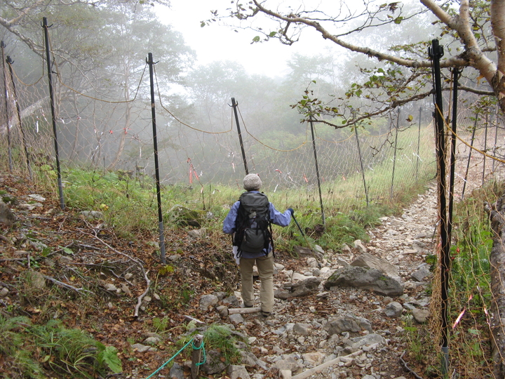 シカ除けネットの間を下っていくと、馬ノ背ヒュッテが見えてきた。