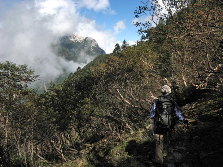 藪沢小屋から少し進むと、甲斐駒ヶ岳の摩利支天が雲の中に見えた。