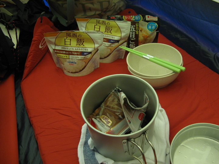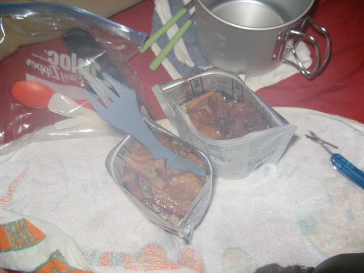 夕飯は豚の角煮。バーナーで湯を沸かし、レトルトの角煮を温めて、アルファ米にも湯を注ぐ。