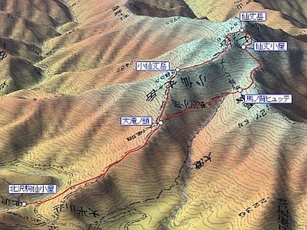 北沢駒仙小屋 7:05 ⇒ 8:45 大滝ノ頭 8:50 ⇒ 9:15 (森林限界ライン) 9:25 ⇒ 10:00 小仙丈ヶ岳 10:15 ⇒ 11:20 仙丈ヶ岳 12:10 ⇒ 仙丈小屋 12:30 ⇒ 13:25 馬ノ背ヒュッテ 13:30 ⇒ 14:25 大滝ノ頭 14:40 ⇒ 北沢駒仙小屋 16:00