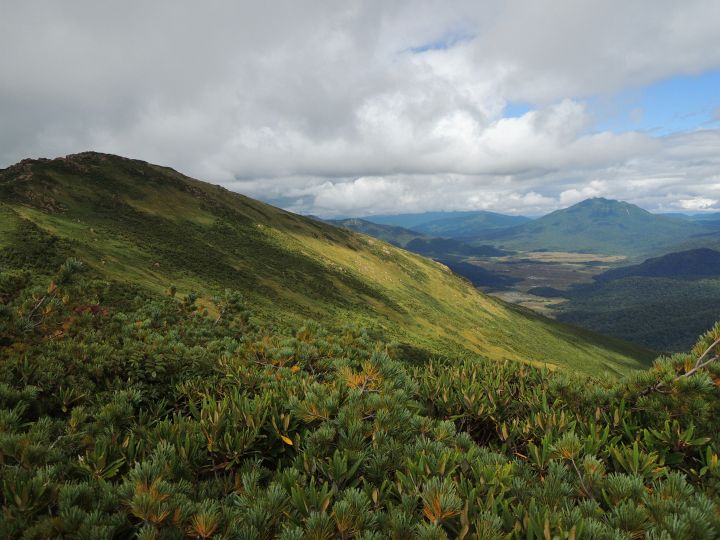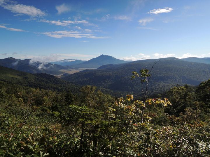 北東には燧ヶ岳と尾瀬ヶ原。早朝はクリアに見えていた。燧ヶ岳の右に棚のように伸びる山は皿伏山(さらぶせやま)。左奥の会津駒ヶ岳には雲がかかっていた。