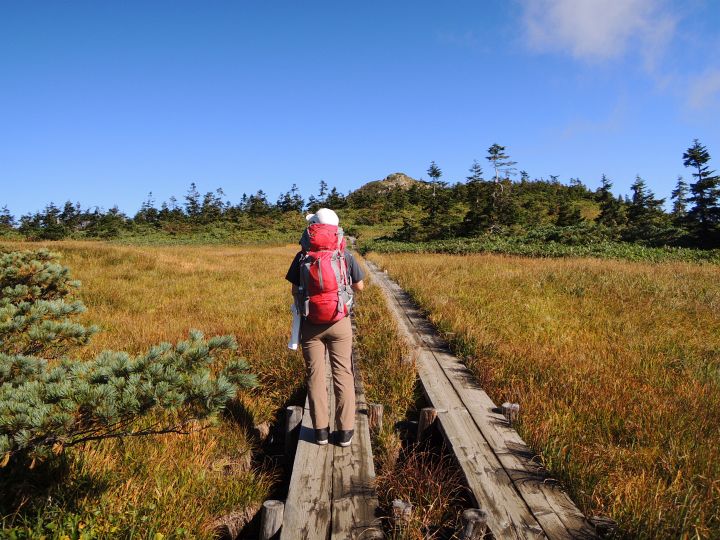 木段を上り終えると、草黄葉の小湿原に出た。正面に至仏山の山頂部が見えてきた。