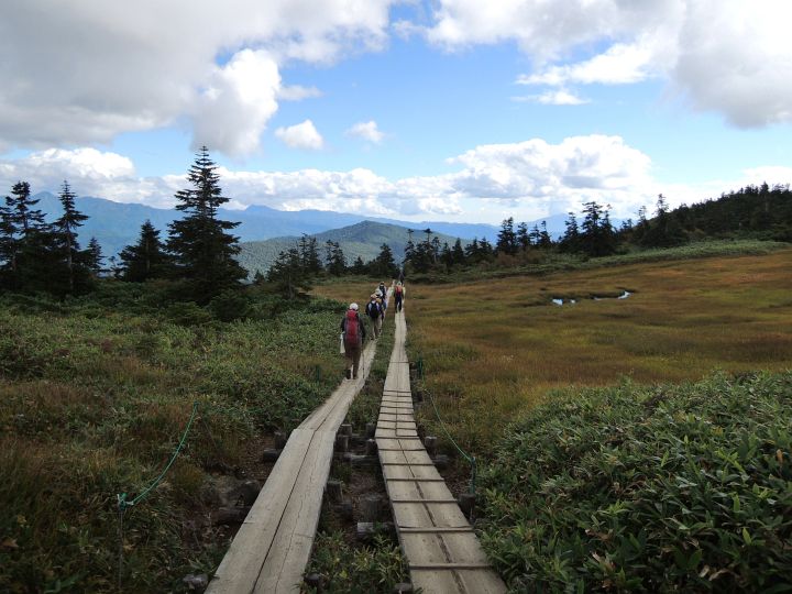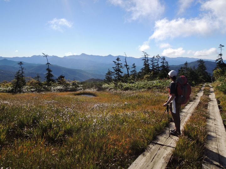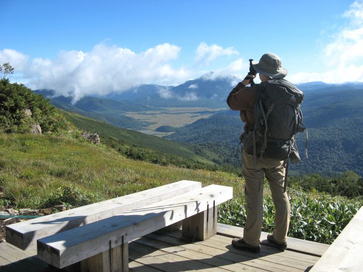 ちょっとした展望台へ続く木道。燧ヶ岳に雲がかかってきた。ちなみに燧ヶ岳の予報は、「てんきとくらす」が朝のうちは晴れ、昼近くにくもりで午後から再び晴れ。「ヤマテン」は晴れのち霧、霧のち晴れ。日本気象協会は終日晴れだった。