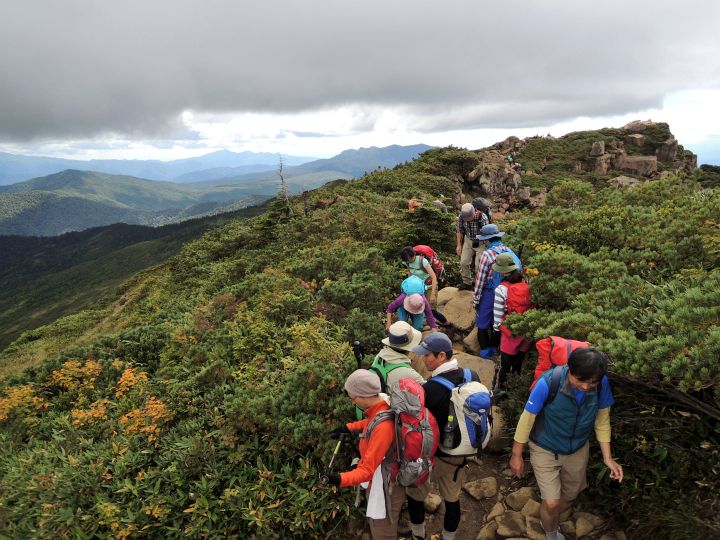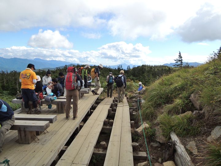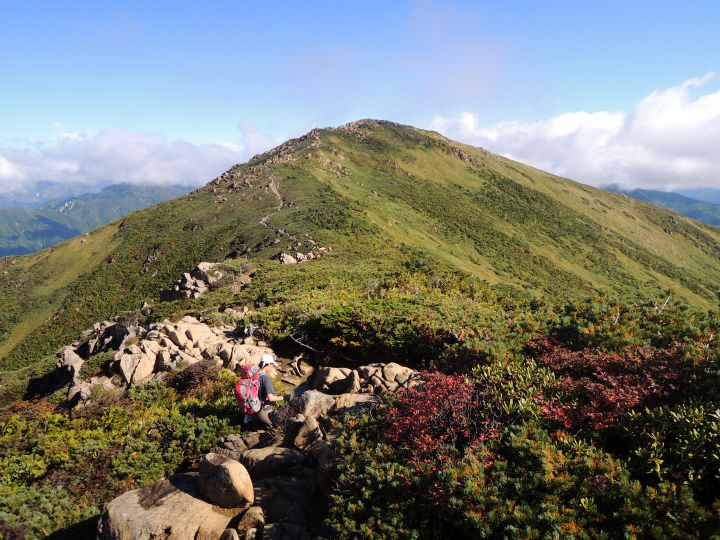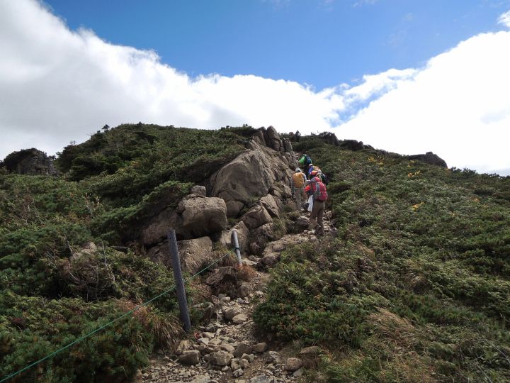 ハイカーの列が連なる小至仏山直下の坂を上る。