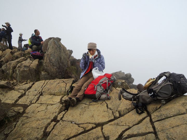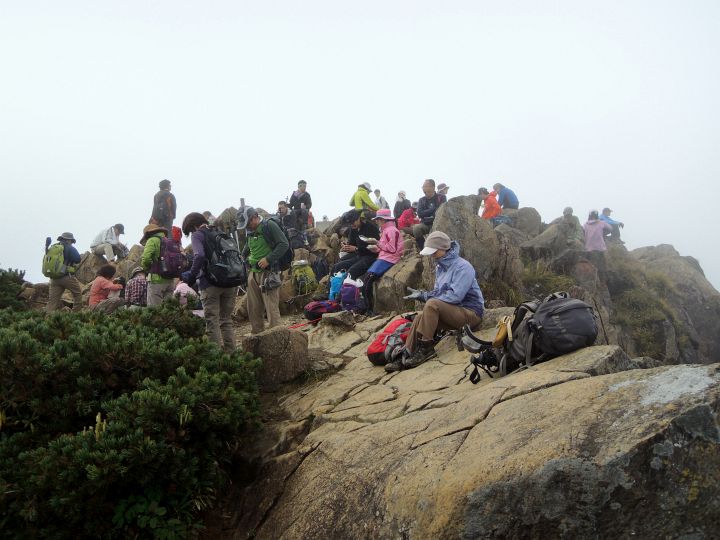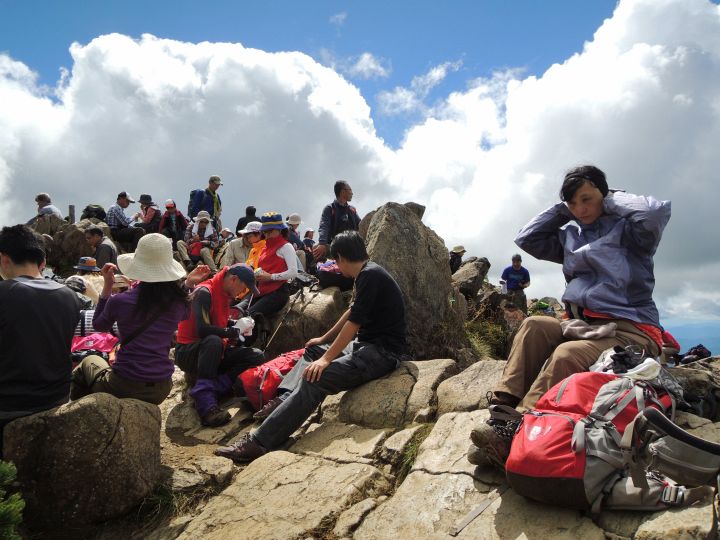 狭い山頂はハイカーで一杯。団体が下りて少し空いたと思っても、次ぎのハイカーが続々と上ってくる。