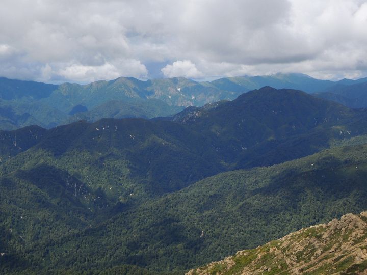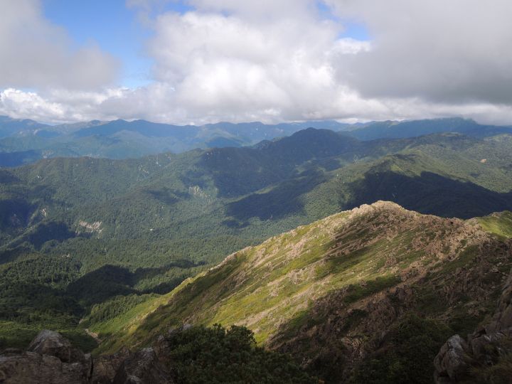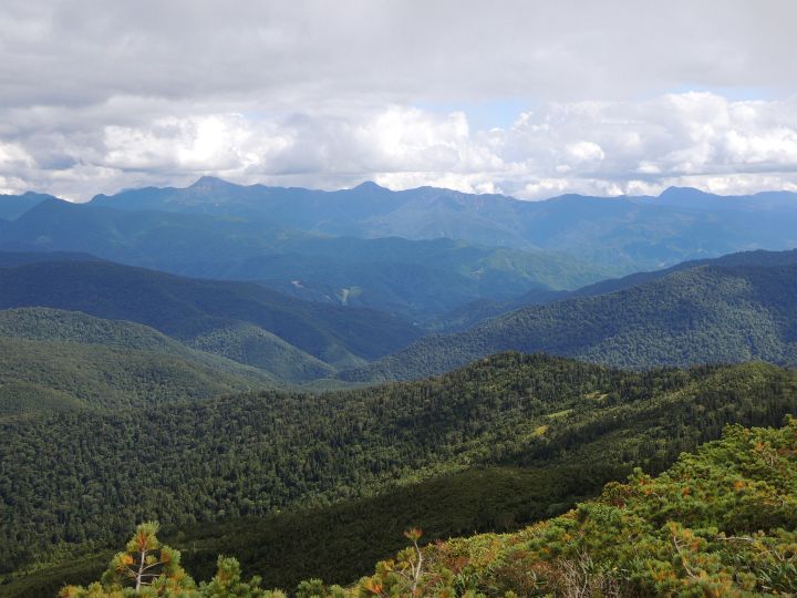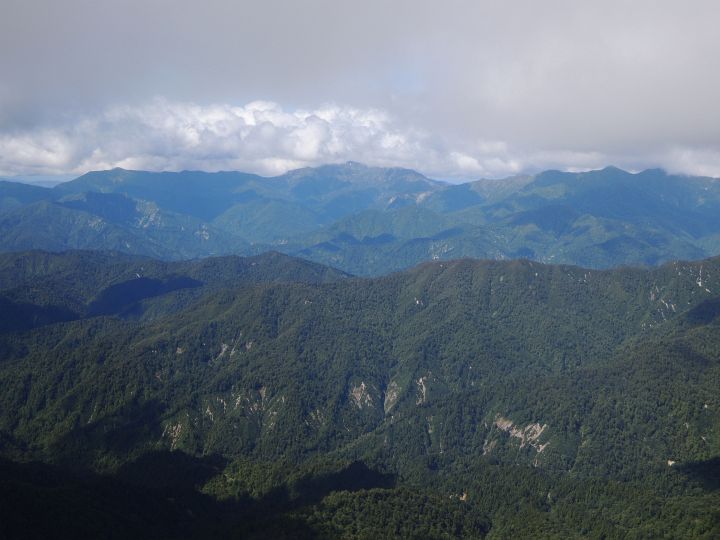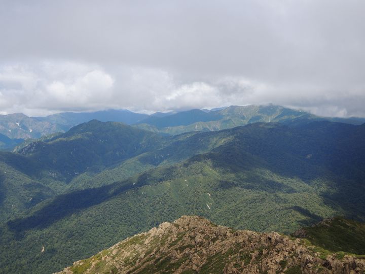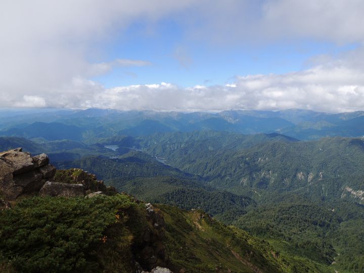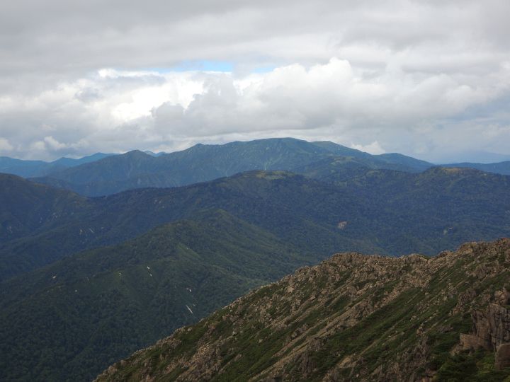 北西の眺め。真ん中に八海山と越後駒ヶ岳が見えるはずだが、やはり山頂部が雲に覆われていた。